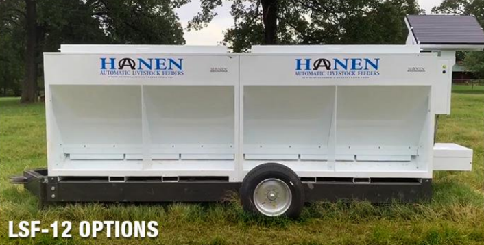 The Hanen LSF-16 Solar Powered Automatic Programmable Livestock Feeder features a hydraulically-powered feed dispensing system powered by a 12-volt battery system that is recharged by a solar panel. The Hanen LSF-16 is the latest time saving equipment for expanding your operational efficiency.